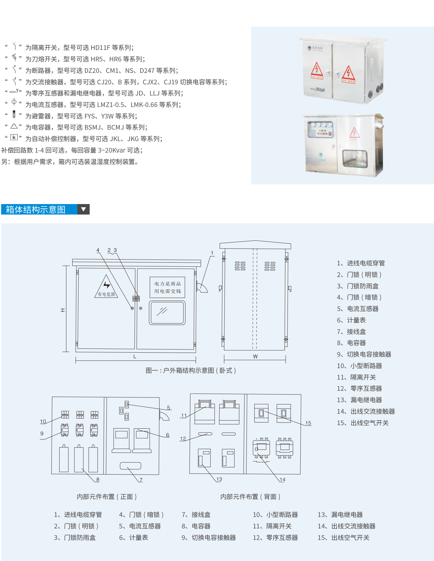 JP系列户外综合配电箱,是集计量、出线、无功补偿等多功能于一体达到户外综合配电装置,具有短路、过载、过电压、漏电保护等功能,体积小、外型美观、经济实用,安装于户外柱上变压器的电杆上,是城乡电网改造的新一代理想配电产品。