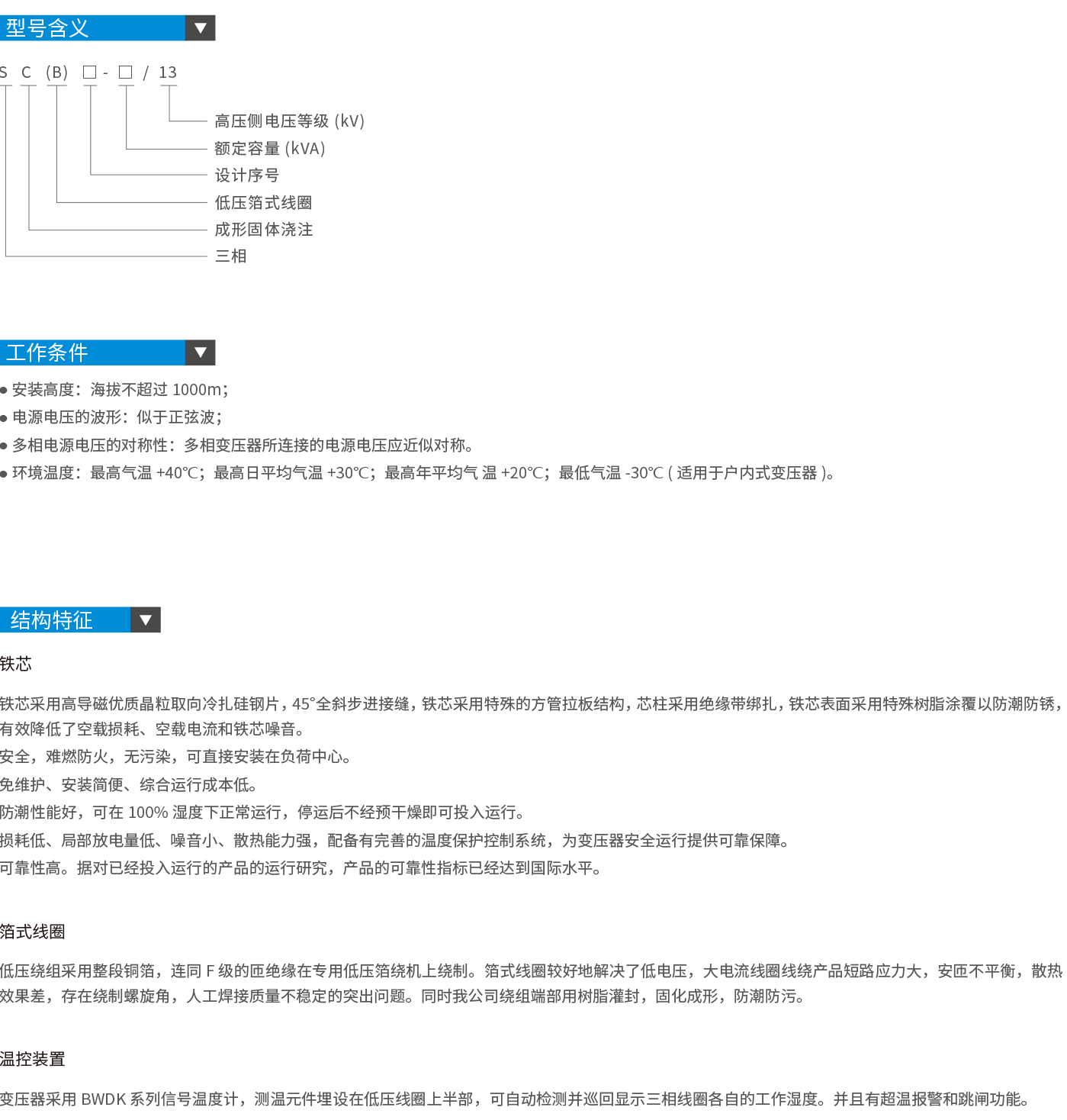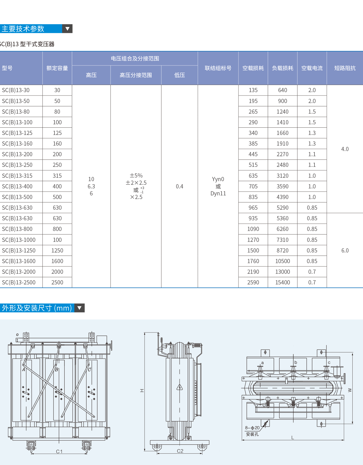 10kV级SC(B)13/14/18型环氧树脂浇注干式变压器,可作为油浸式配电变压器的更新换代产品,是各类干式变压器中性能优的产品,特别适用于城市电网、高层建筑、商务中心、剧院、医院、宾馆、隧道、地铁、车站、码头、机场、地下电站、试验室、组合变电站等重要场所。