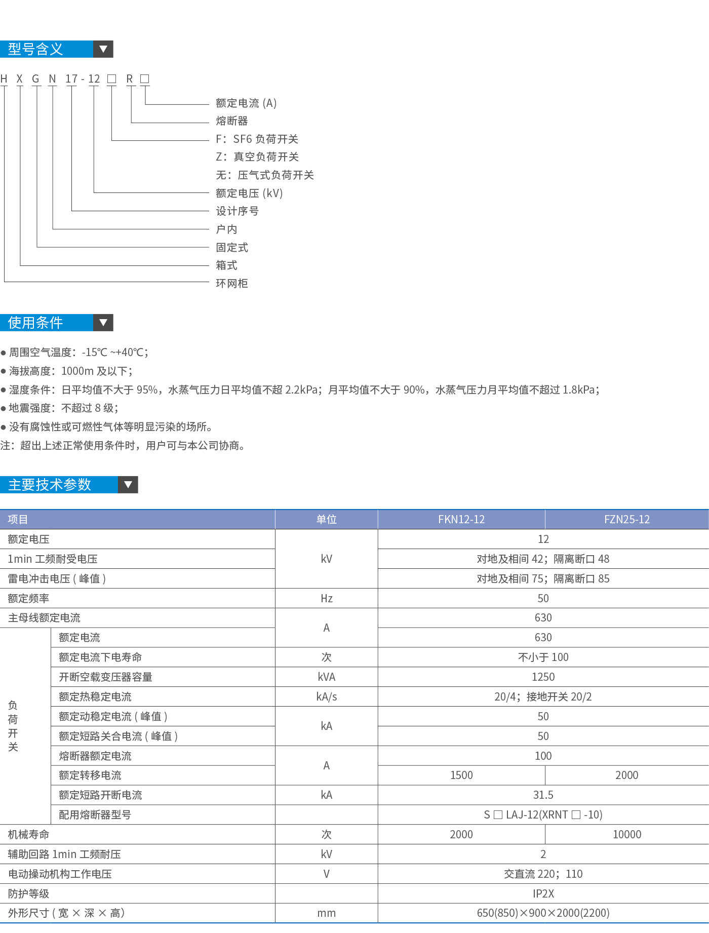 HXGN17-12交流金属环网开关设备(真空开关)(简称环网柜),是为城市电网改造和建设需要而生产的新型高压开关设备。在供电系统中亦作为开断负荷电流和短路电流以及关合短路电流之用,本环网柜配用FZRN25、FZRN21真空负荷开关,操作机构为弹簧机构,该机构既可手动操作,也可电动操作。接地开关和隔离刀配用手动操作机构,本环网柜成套性强、体积小、无燃烧和爆炸危险,还具有可靠的“五防”功能。 本环网柜符合GB3906《3-35kV交流金属封闭开关设备》、IEC60420《高压交流负荷开关熔断器组合电器》标准的有关规定。