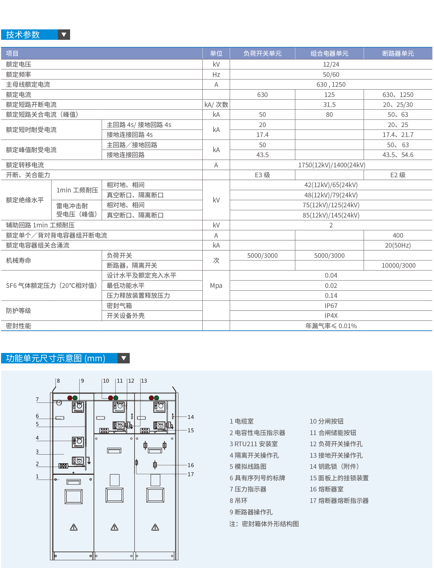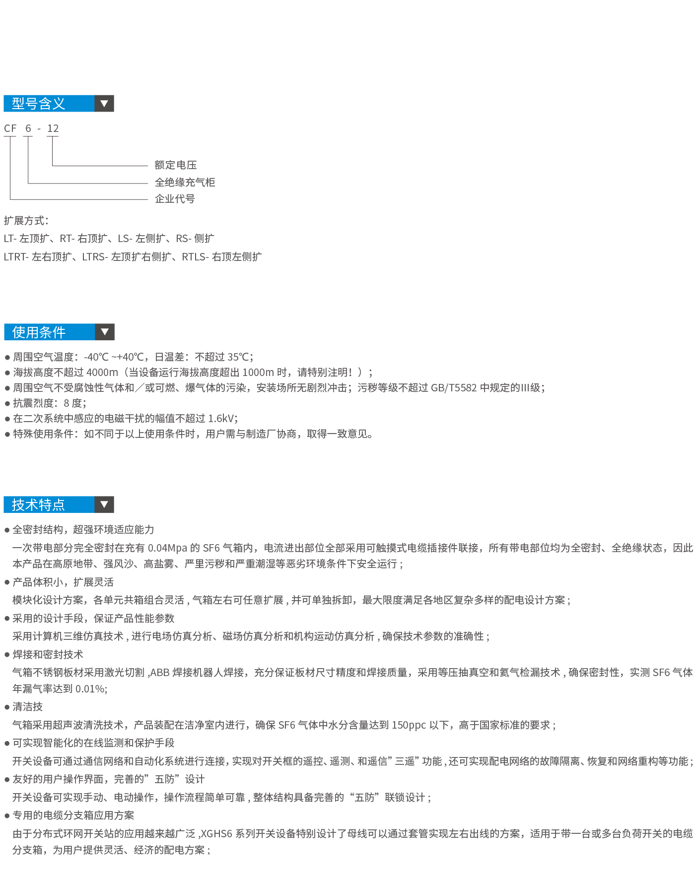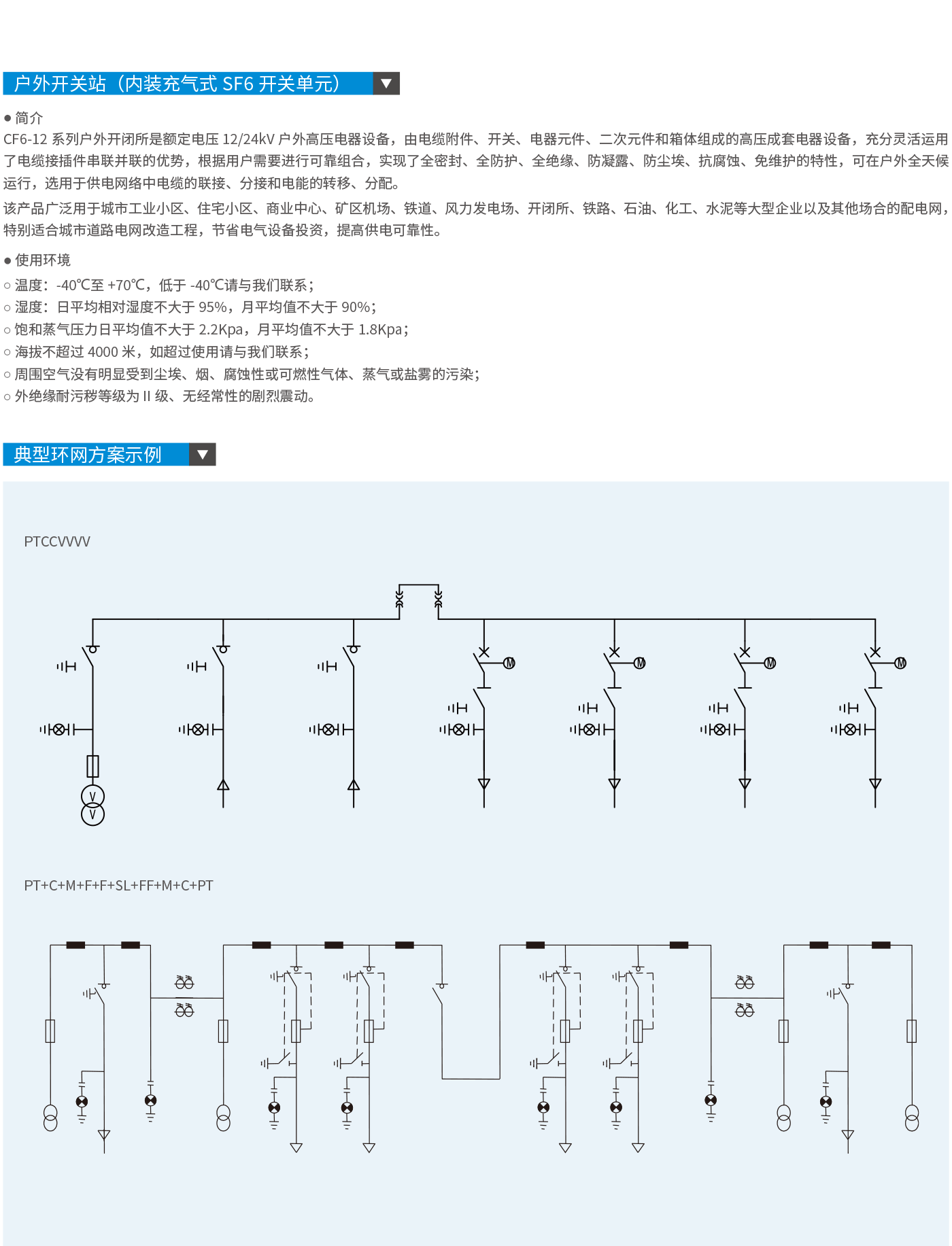 CF6-12气体绝缘金属封闭开关设备系三相交流50Hz,SF6气体全绝缘全密封的金属封闭开关设备。 采用模块化设计,以真空断路器、负荷开关、负荷开关-熔断器组合电器、隔离开关等主开关作为功能单元,置于密封气箱内构成各充气隔室单元,其母线通过母线联结器可以在左右方向任意扩展,进出线采用插接式电缆。不受环境影响,安全性高,免维护,可靠性强。 广泛应用于工业及民用环网配电系统及供电末端,特别适用于小型二次配电站、工矿企业开闭所、城市住宅小区、机场、铁路等场所。